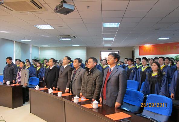 会上,周建江院长做了热情洋溢的讲话。他代表学院向圆满完成学业的研究生们表示热烈的祝贺,向为培养研究生成长成才而倾注心血和汗水的全体导师们表示衷心的感谢,并对即将走进社会、走上工作岗位的研究生们寄予了厚望,他希望同学们能做到“学而不知,不断创新”、“坚定理想,完善人格”、“自强不息,永葆激情”。毕业生代表给学院献礼更是将此次典礼推向了高潮。最后,周院长为每一位毕业生拨流苏、授学位,履行了神圣庄重的学位授予仪式。毕业典礼在师生们的合影与惜别之情中落下帷幕。