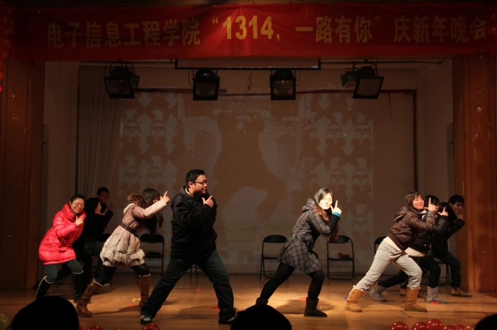 晚会在动感十足的舞蹈“江南STYLE”中拉开了序幕,接下来是乐器独奏、双人舞、相声、小品、歌曲串烧、舞龙表演等形式多样的节目。其中,相声《当行论》和大四学生带来的小品《寺院甄�传》则发挥了十足的搞笑功力,将全场气氛推向高潮。晚会的另一大亮点是由四院的十佳歌手代表周文柏、许金带来的歌曲《因为爱情》和新晋十佳白金奖获得者罗迪带来的《一路上有你》,十佳歌手们的动人演绎让在座观众陶醉不已。互动环节也亮点多多,第一个互动环节中,学院党委书记冯绍红老师和副书记季海群老师亲身向同学们示范绕口令;第二个互动环节中,由主持人扮演的末日奶牛在互动中惩罚四院同学,最后由四院勇士袁李华老师射杀末日奶牛为同学们主持正义,精彩的桥段让在座老师同学们捧腹不已。随后,各学院学生会主席通过视频向现场的老师和同学们送来新年的祝福。最后,周建江院长向在座老师和同学们发出了新年的祝福,并希望同学们好好学习,全面发展。