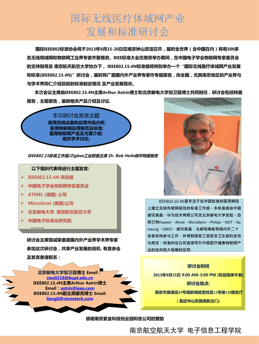 “国际无线医疗体域网产业发展和标准研讨会”拟于2013年9月15号上午9点在A12号楼128会议室召开。该会议由成人漫画 产业教授郦亮博士主持,成人漫画 协办。欢迎各位老师同学踊跃参加。