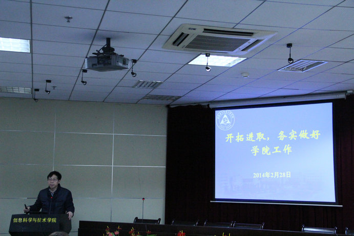 接着,会议进行了2014年工作部署。常务副院长周建江首先传达了学校第十五届党委第十次全委(扩大)会议精神。周院长结合学院特色对聂宏校长的报告做了重点诠释,并以“压力、担忧、责任”为关键词,号召全院教职工奋发有为,齐心谋划学院发展。随后,周院长以“开拓进取,务实做好学院工作”为题,从学院面临的机遇与挑战入手,向大会汇报了2014年学院主要工作内容,重点介绍了学院在体制机制改革和制度创新方面的工作思路、学院深化“一提三优”工程(二期)建设在人才培养、教学、科研和师资队伍建设方面的举措等。