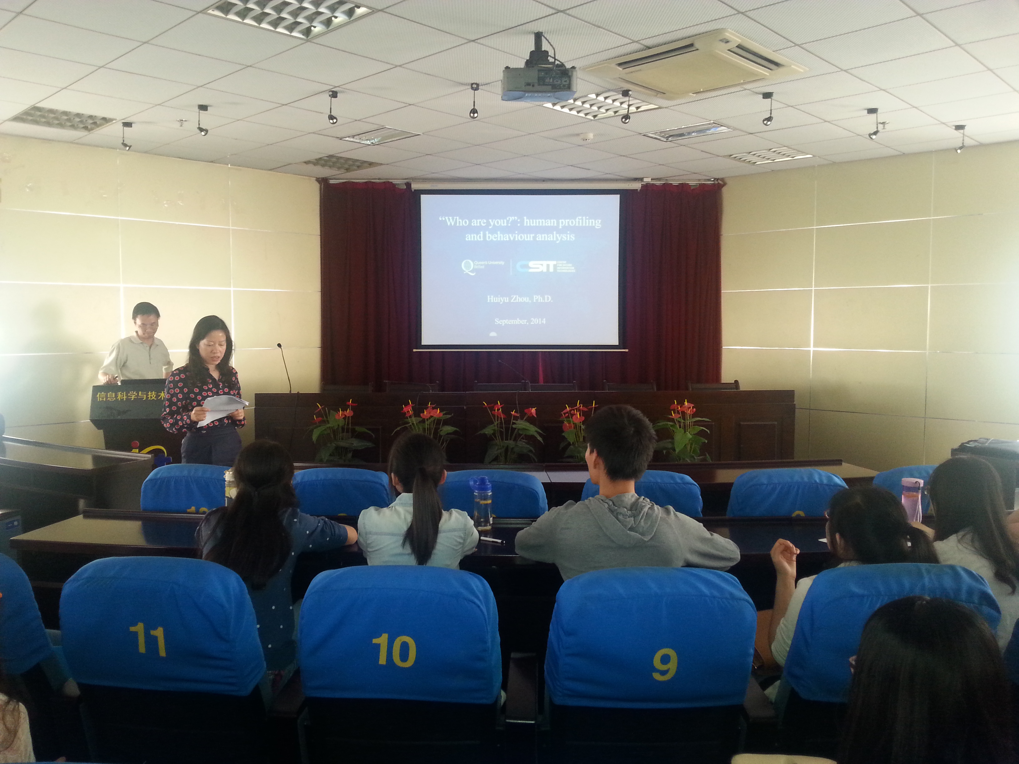 2014年9月20日下午,英国贝尔法斯特女王大学周挥宇博士应邀访问了成人漫画 ,并为我校师生带来了一场题为“Who are you? Human profiling and behavior analysis”的学术报告,报告中介绍了女王大学英国国家信息安全中心(CSIT)视频识别研究的背景,并对年龄识别,性别识别以及行为分析的方法和技术进行了详细的讨论。报告会由信息与通信工程系副主任黎宁老师主持,成人漫画 常务副院长周建江教授,以及郭荣辉、汪飞、李海林、夏伟杰、刘伟强、肖昊等老师和相关领域的研究生共同参加了报告会。周博士的精彩报告受到了与会师生的热烈欢迎,大家就感兴趣的问题与周博士进行了交流与讨论。