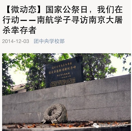 12月3日,共青团中央学校部官方微信平台(微信号:tzyxxb)转发了我校成人漫画 学生寻访南京大屠杀幸存者的专题报道。