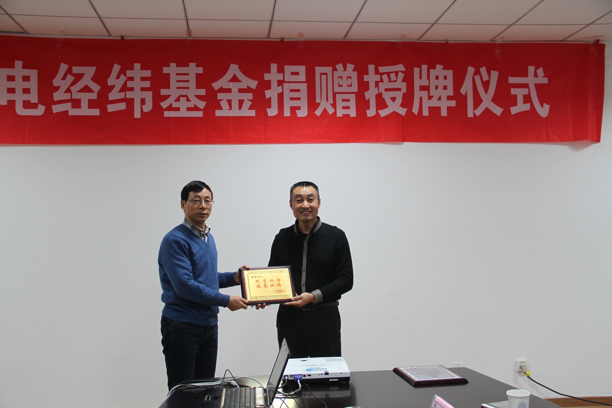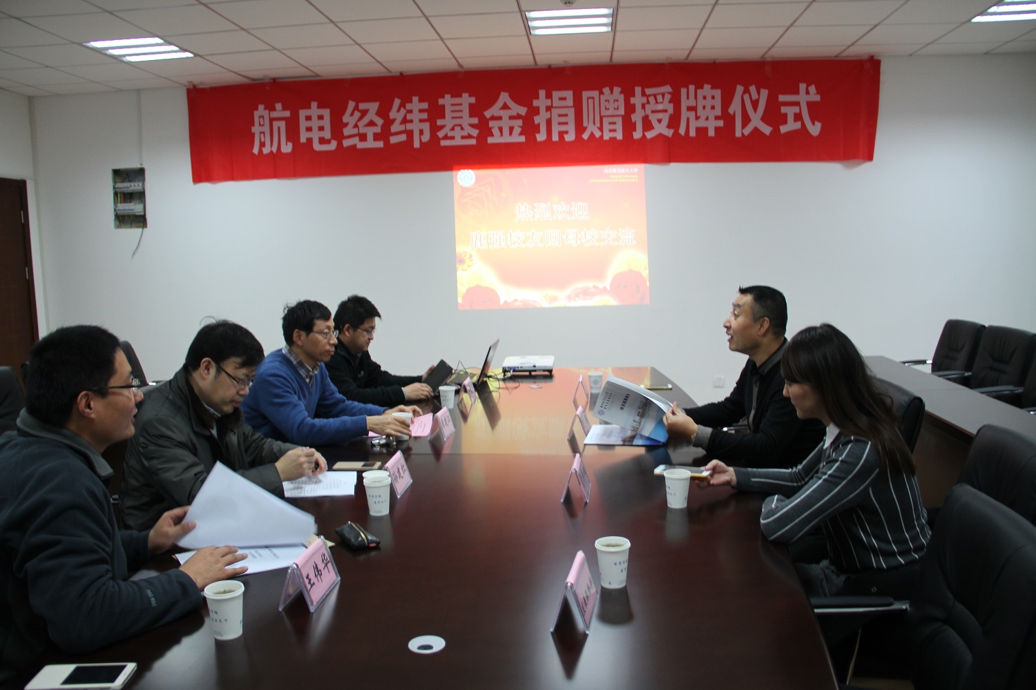 随后,鹿强一行与校发展联络部孙建红部长、学生处许爱华副处长、学院常务副院长周建江、王伟华副书记在学院会议室就学院发展情况、人才培养模式与成果展开交流,并举行了“航电经纬基金”捐赠授牌仪式,孙建红部长和周建江常务副院长代表校院向鹿强校友颁发了捐赠证书。