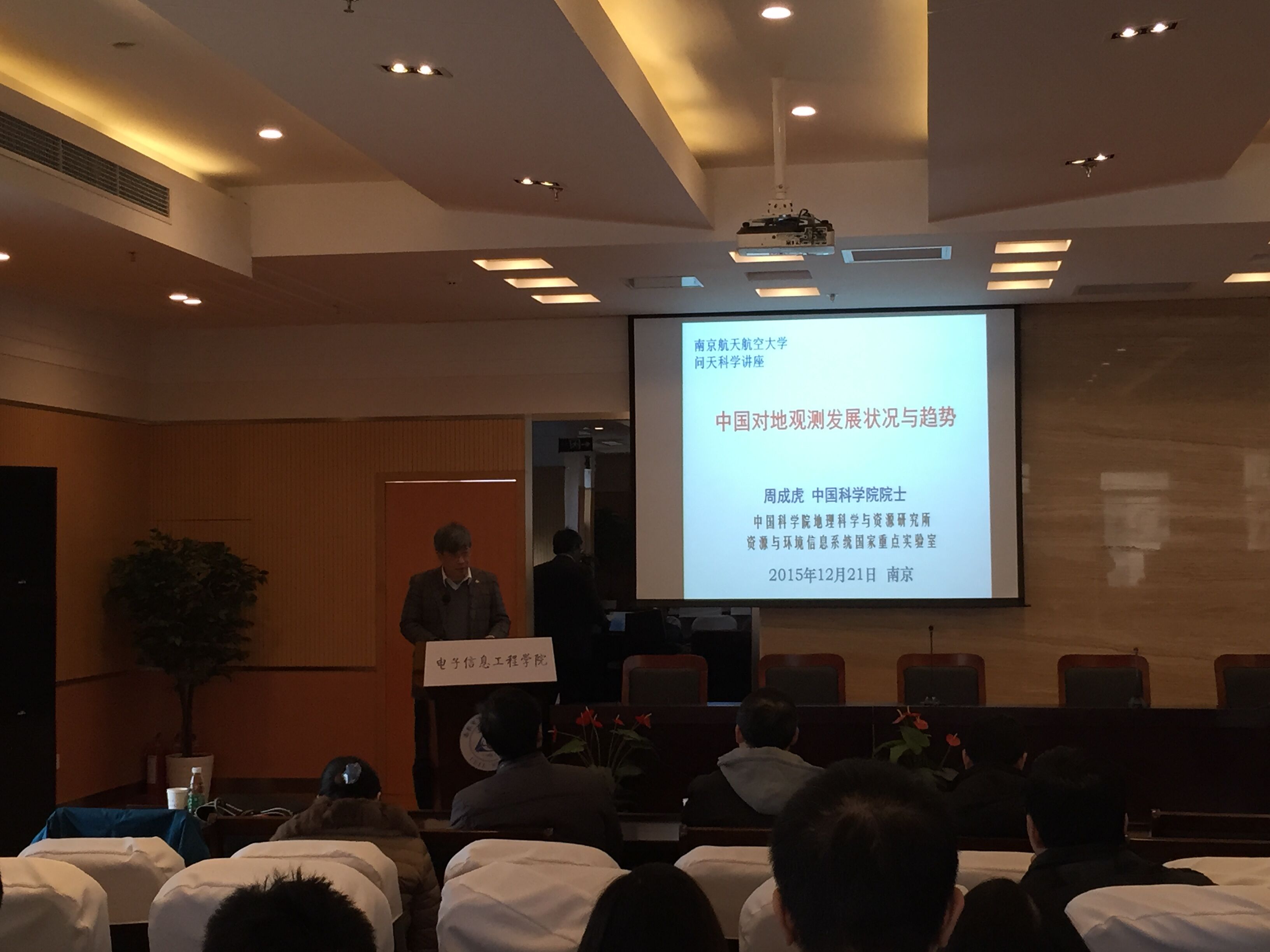 2015年12月21日,中国科学院院士、中国科学院地理科学与资源研究所研究员,地理信息系统与遥感应用专家周成虎教授来我校访学,并以《中国对地观测发展状况与趋势》为主题做了学术报告。报告会在成人漫画 515报告厅举行,由校长助理熊克主持,成人漫画 与航天学院的教师、学生参加了此次报告会。
