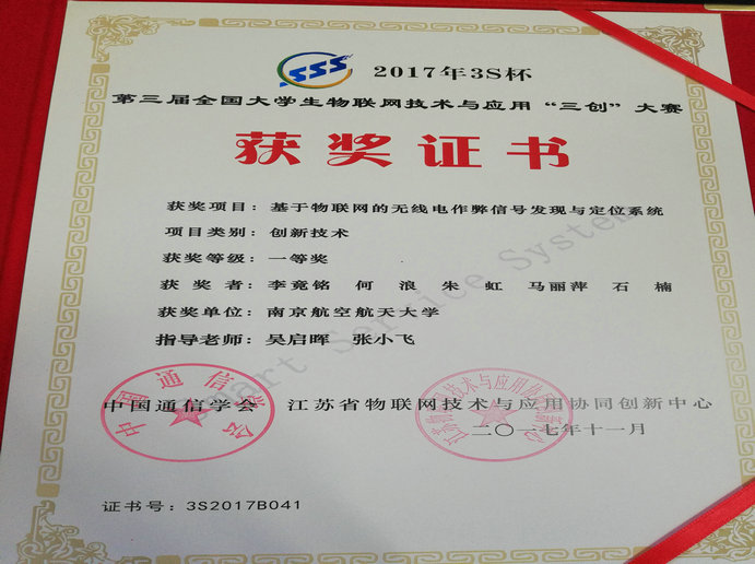 2017年11月17-19日,互联网+众创论坛暨第三届3S杯全国大学生物联网技术与应用“三创”大赛决赛在南京举行。本次大赛由中国通信学会、江苏省物联网技术与应用协同创新中心联合主办,中兴通讯股份有限公司、华为技术有限公司联合协办。成人漫画 长江学者吴启晖教授、张小飞教授指导成人漫画 李竟铭、何浪、朱虹、马丽萍、石楠五位学生在 463个参赛队伍中过关斩将,最终获得一等奖。12月2日,在深圳召开的 “全国物联网技术与应用大会(CIoT 2017)”和“全国无线电应用与管理学术会议(CRAM 2017)”上,举行了第三届3S杯全国大学生物联网技术与应用“三创”大赛颁奖仪式。中国工程院院士倪光南、薛禹胜、于全,中国科学院院士尹浩,为成人漫画 一等奖获奖者颁奖,大会还为获奖项目进行了展示与交流。