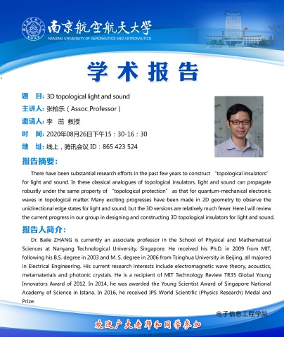 2020年8月26日,应学院李茁教授邀请,新加坡南洋理工大学及新加坡国立大学的四位知名教授将带来四场有关光学超材料和表面等离激元前沿理论及应用的精彩报告。以下为系列报告的报告主题和专家相关信息,报告以线上直播为主。
