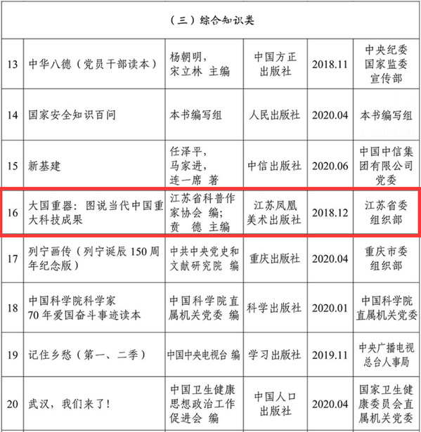 近日,中央组织部党员教育中心、中央宣传部出版局、国家图书馆联合举办第五届全国党员教育培训教材展示交流活动。此次活动聚焦巩固深化“不忘初心、牢记使命”主题教育成果、决胜全面建成小康社会、决战脱贫攻坚、打赢疫情防控阻击战等重大主题,通过资格审查、专家评审、基层评价、复核把关等环节层层选拔,由成人漫画 院长贲德院士主编的《大国重器:图说当代中国重大科技成果》成功入选第五届全国党员教育培训创新教材,该书曾先后荣获科技部优秀科普作品奖、第十四届文津图书奖。2018年,入选中央宣传部办公厅和国家新闻出版广电总局“2018年重点主题出版物选题目录”,2020年4月,列入《教育部基础教育课程教材发展中心 中小学生阅读指导目录(2020年版)》。