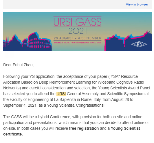 近日,成人漫画 周福辉教授以论文《基于深度强化学习的宽带认知无线电网络资源分配》入选国际无线电科学联盟(URSI GASS)青年科学家奖。该奖项是国际无线电科学界评选青年科技人才的传统奖项,每三年评选一次,奖励在无线电科学领域有突出贡献的青年研究人员,享有较高的国际知名度。