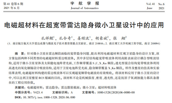 神舟十二号载人飞船发射之际,成人漫画 电磁隐身与超材料应用课题组也将“电磁超材料在超宽带雷达隐身微小卫星设计中的应用”这一研究成果发表在《宇航学报》上,课题组设计的两款电磁超构隐身材料成功应用于微小卫星的设计中,实现卫星整星RCS缩减的目的,在机械强度、密度、透光性,抗原子氧剥蚀能力方面均具备工程应用价值。目前,该研究成果在航天八院的部署下,处于在轨整星实验验证阶段。