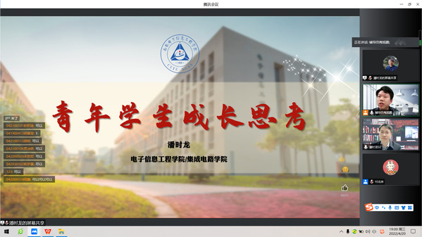 4月20日晚,我院开展首期慧通讲堂,慧通讲堂取名于学院院训“经纬天地,慧通时空”,旨在邀请各行各业专家教授与同学们话成长、谈奋斗、创未来。学院常务副院长潘时龙主讲了首期慧通讲堂,题为《青年学生成长思考》。讲堂由2020级本科生辅导员梅旭鹏主持,学院党委副书记雷蕾、团委书记席维唯、各年级辅导员及四百多名同学在线参加了此次讲堂,累计获得3.3w点赞。
