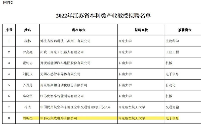 2022年9月21日,江苏省教育厅公示了2022年江苏省产业教授(兼职)选聘结果,成人漫画 推荐的中科芯集成电路有限公司通用技术研究室主任周昕杰成功入选本科类产业教授拟聘名单。