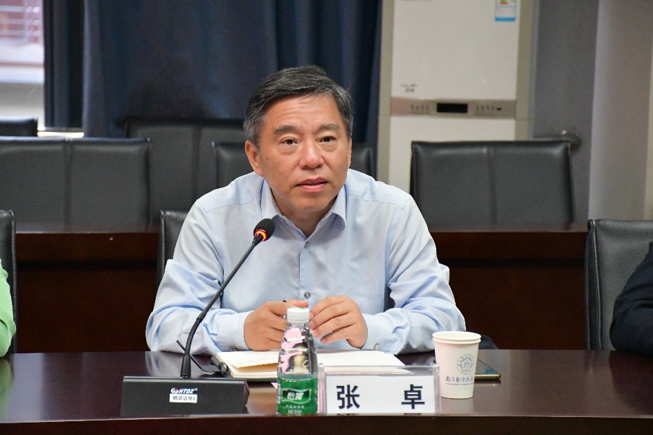 张卓介绍了调研背景。他首先肯定了学院对于南航-布大创新人才推进中心和引智基地建设的突出贡献。之后介绍了国合未来工作设想和计划,希望学院一同助力,积极申报和推进核心国际合作项目,联通国际,助力师生、学科及学校三个层次的发展,并按照“一四一二”战略(即一个网络,四个平台,一支队伍,两个系统)进行落实。