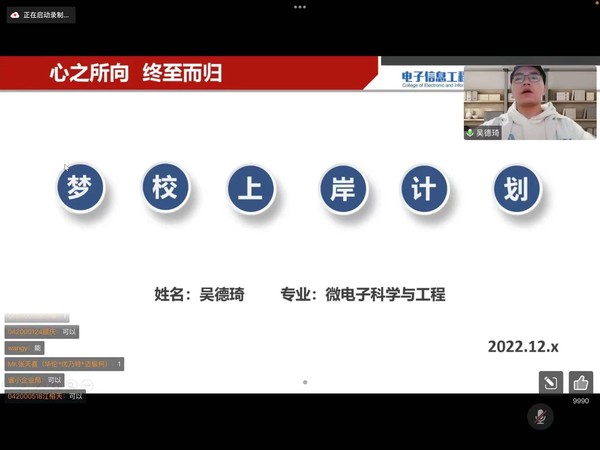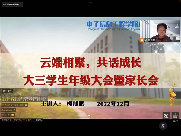 为了进一步引导学生提前做好学业规划,塑造学院优良学风,同时确保同学们安全、有序离校。12月13日,成人漫画 /集成电路学院召开“云端相聚,共话成长”2020级本科生主题年级大会暨家长会,由辅导员梅旭鹏主持。参加此次会议的还有学院兼职辅导员崔甜,2020级全体学生及学生家长。