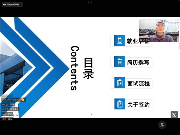 2019级优秀就业代表刘子庆从就业准备、简历撰写、面试流程和签约注意事项四个方面与同学们进行了经验分享,为有就业意向的同学提供了很大的帮助。