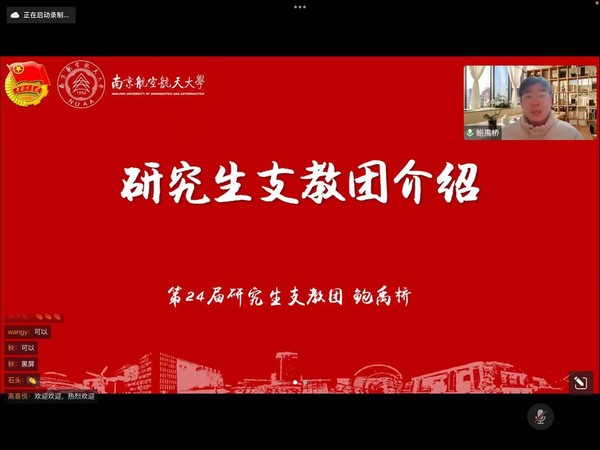 第24届研究生支教团团长的鲍禹桥同学进行了专题分享,他详细地介绍了南航研究生支教团,并为同学们解答了相关疑惑。
