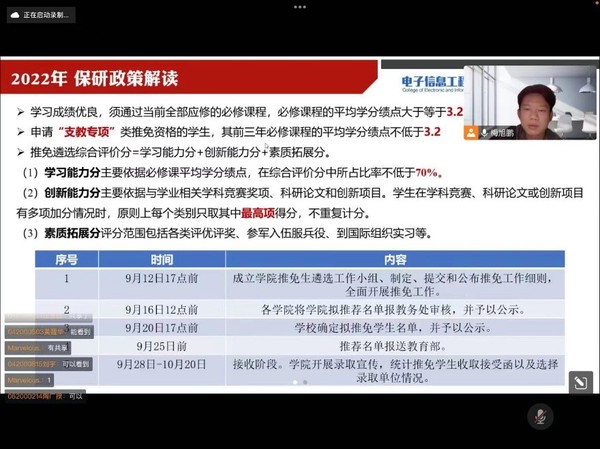 此外,梅旭鹏还根据同学们的职业规划,对目前的保研政策进行解读,并对比分析了历年保研考研数据,最后对同学们提出了期望和建议。