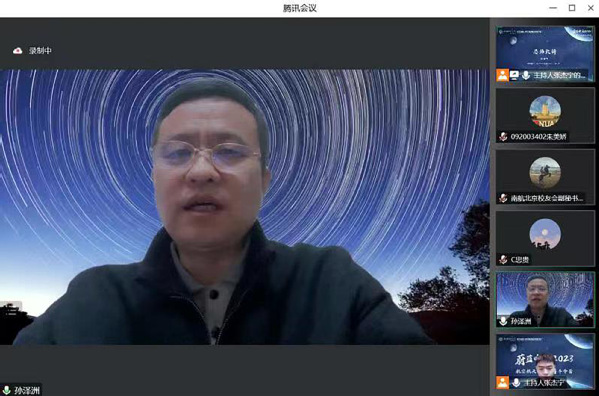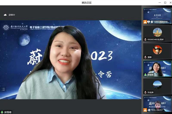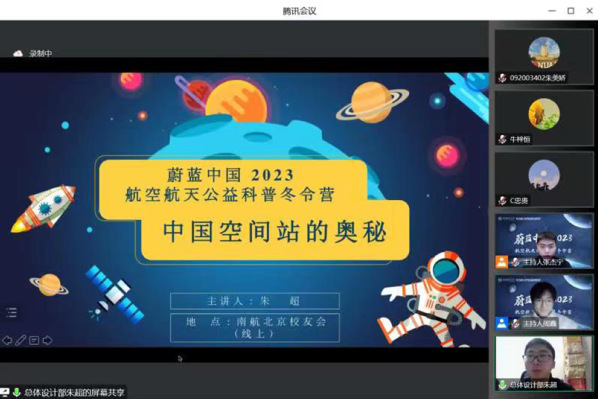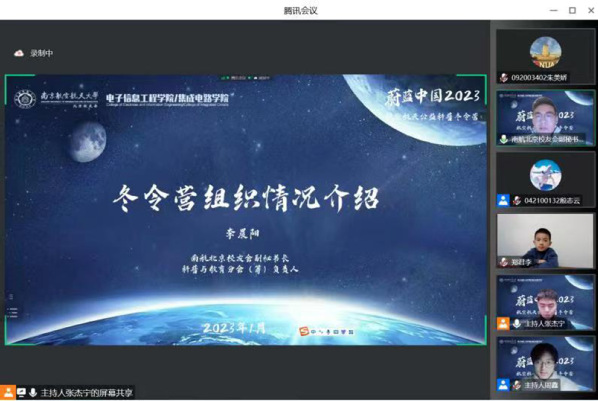 2023年1月14日晚,学院联合南航北京校友会校友之家、科普与教育分会(筹)共同开展的“蔚蓝中国2023”航空航天公益科普冬令营正式开营。南航北京校友会副会长、中国北斗三号卫星系统总设计师陈忠贵,嫦娥四号、天问一号探测器系统总设计师孙泽洲,航天五院中国空间站机械臂设计师朱超,南航北京校友会副秘书长、校友之家负责人潘娜,南航北京校友会副秘书长、科普与教育分会(筹)负责人李晨阳,南航成人漫画 /集成电路学院团委书记席维唯出席活动并分别致辞。成人漫画 师生代表、校友及其子女,以及来自江苏、河南、贵州、江西等地学生约180人参加活动。