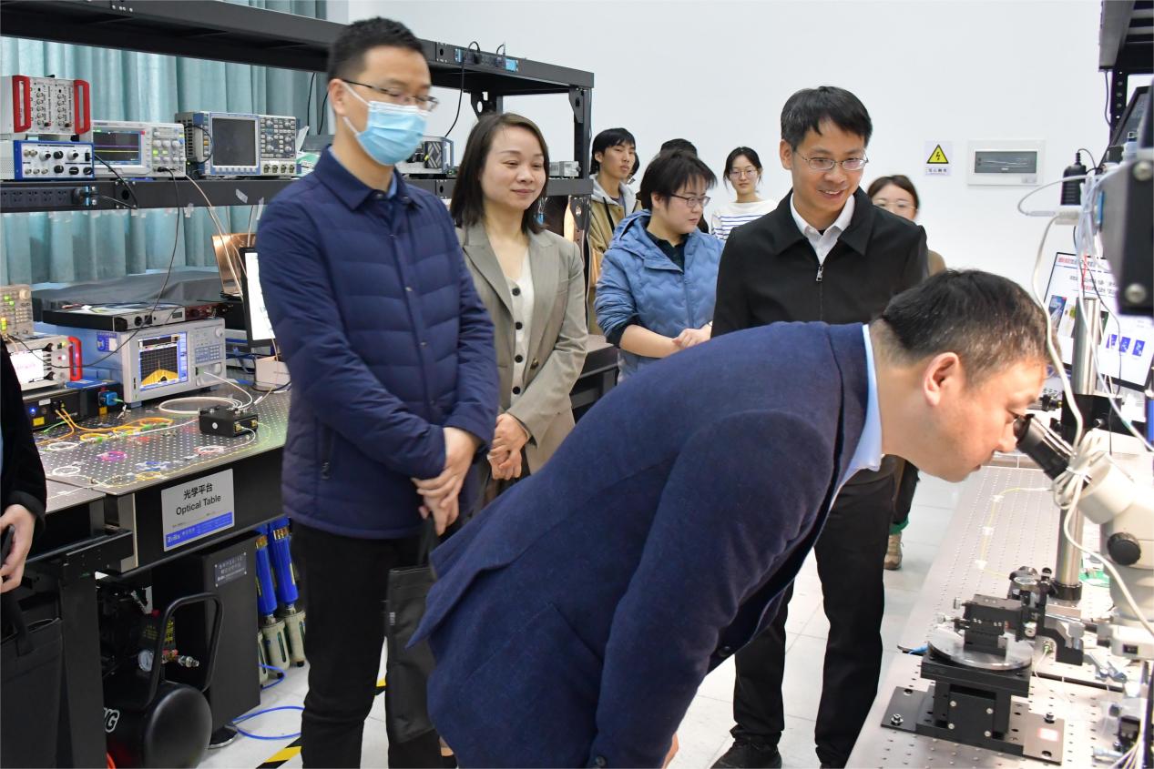 陆慧一行来到成人漫画 的微波光子技术国家级重点实验室参观科研设备和重点成果。成人漫画 常务副院长潘时龙介绍了微波光子技术国家级重点实验室的整体情况,展示了光矢量分析系列仪表、光生微波源、微波光子实时频谱测量仪、光载GNSS一机多天线系统、新型光子器件与芯片等成果。