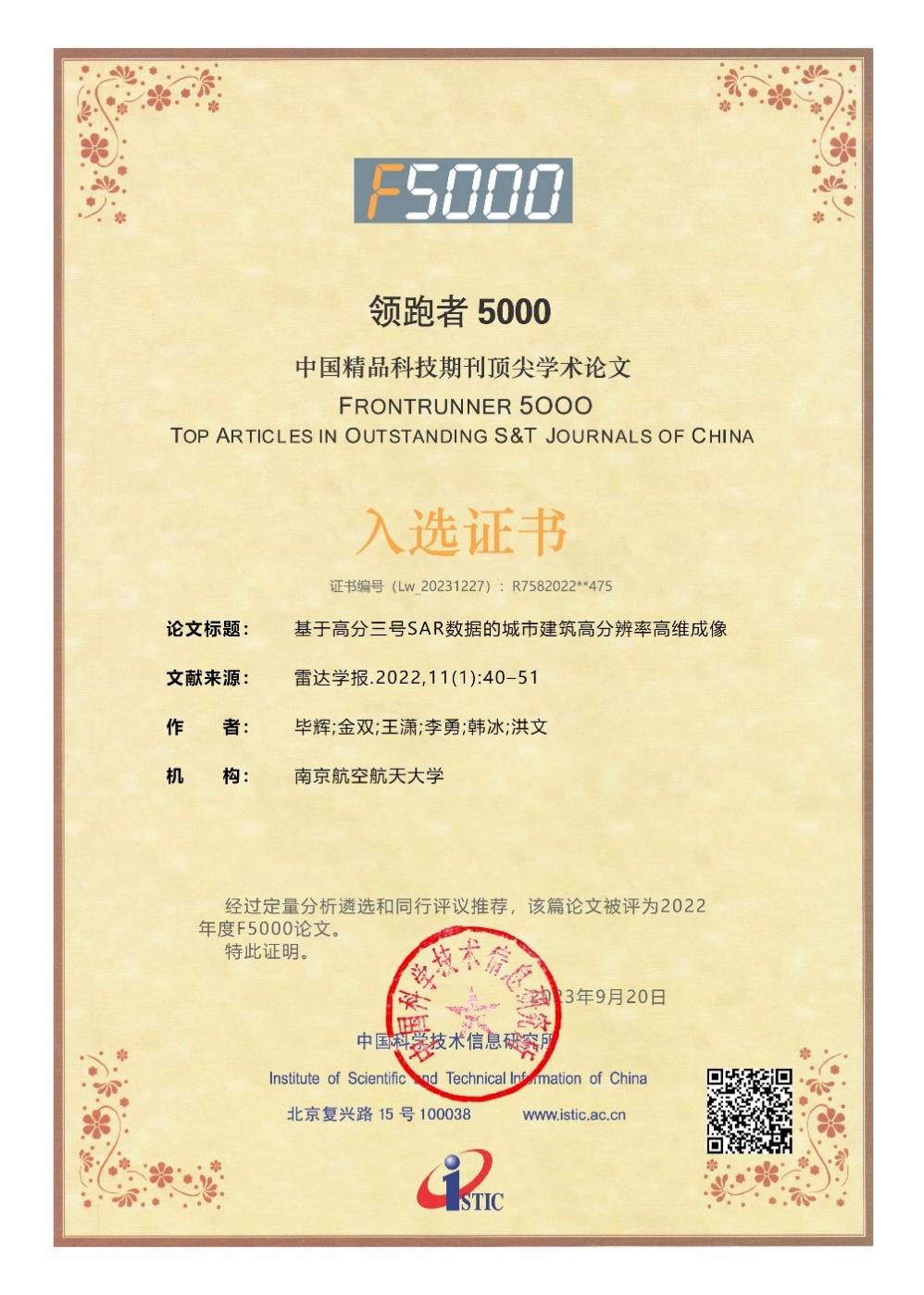 2023年9月20日,科技部中国科学技术信息研究所公布了2022年度“领跑者5000——中国精品科技期刊顶尖学术论文(Frontrunner 5000,简称F5000)”获奖名单,成人漫画 朱岱寅教授、毕辉教授课题组论文《基于高分三号SAR数据的城市建筑高分辨率高维成像》(雷达学报. 2022, 11(1): 40-51. 毕辉, 金双, 王潇, 李勇, 韩冰, 洪文.)荣获该奖项。