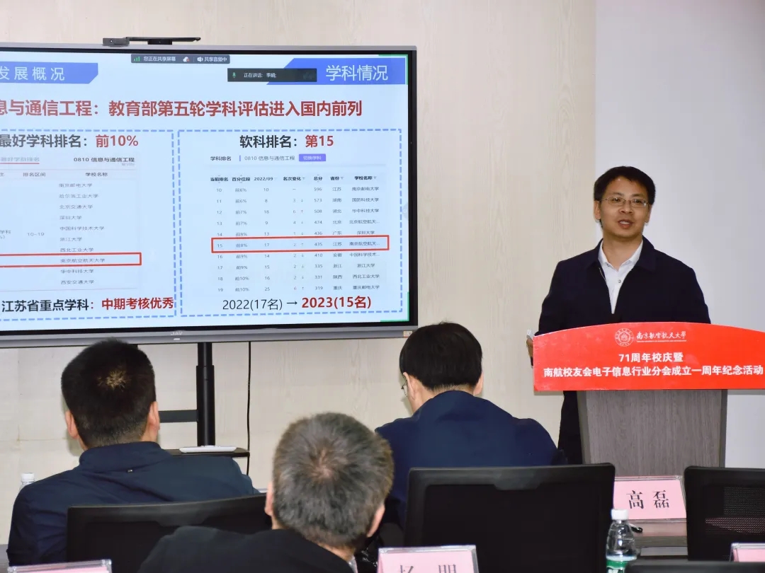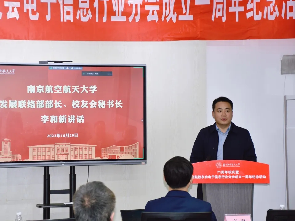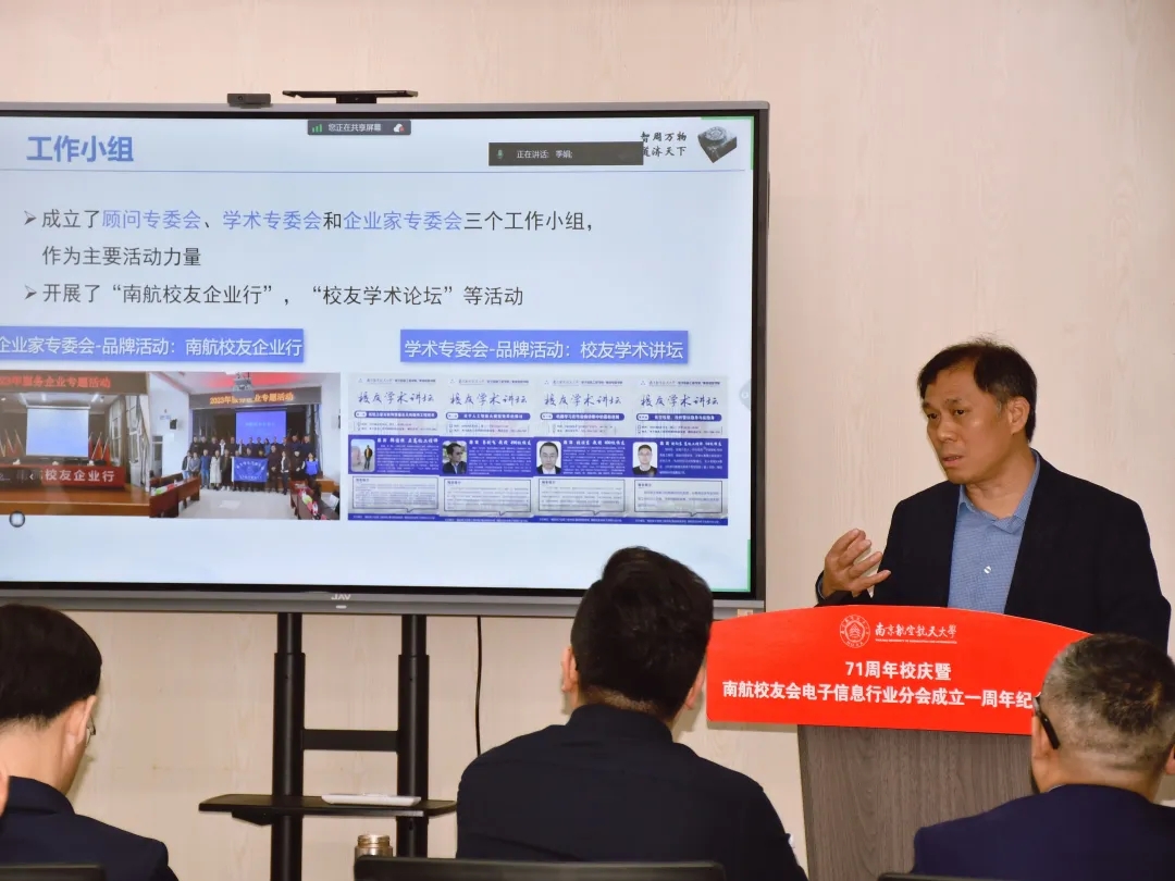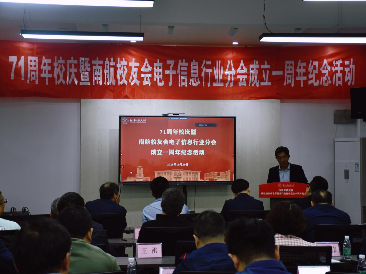 值此南航建校71周年之际,20231029日下午,“71周年校庆暨南航校友会电子信息行业分会成立一周年纪念活动”在南京新工秦淮硅巷柳树湾数创科技园会议中心举行。学校发展联络部部长、校友会秘书长李和新,学院党委书记季海群、常务副院长潘时龙、原党委书记聂东林、副院长刘伟强,特邀嘉宾,电子信息行业分会理事会成员、各专委会成员出席了此次活动。活动分为学术报告和庆祝会议两个阶段,分别由分会副秘书长何小祥、秘书长王腾主持。