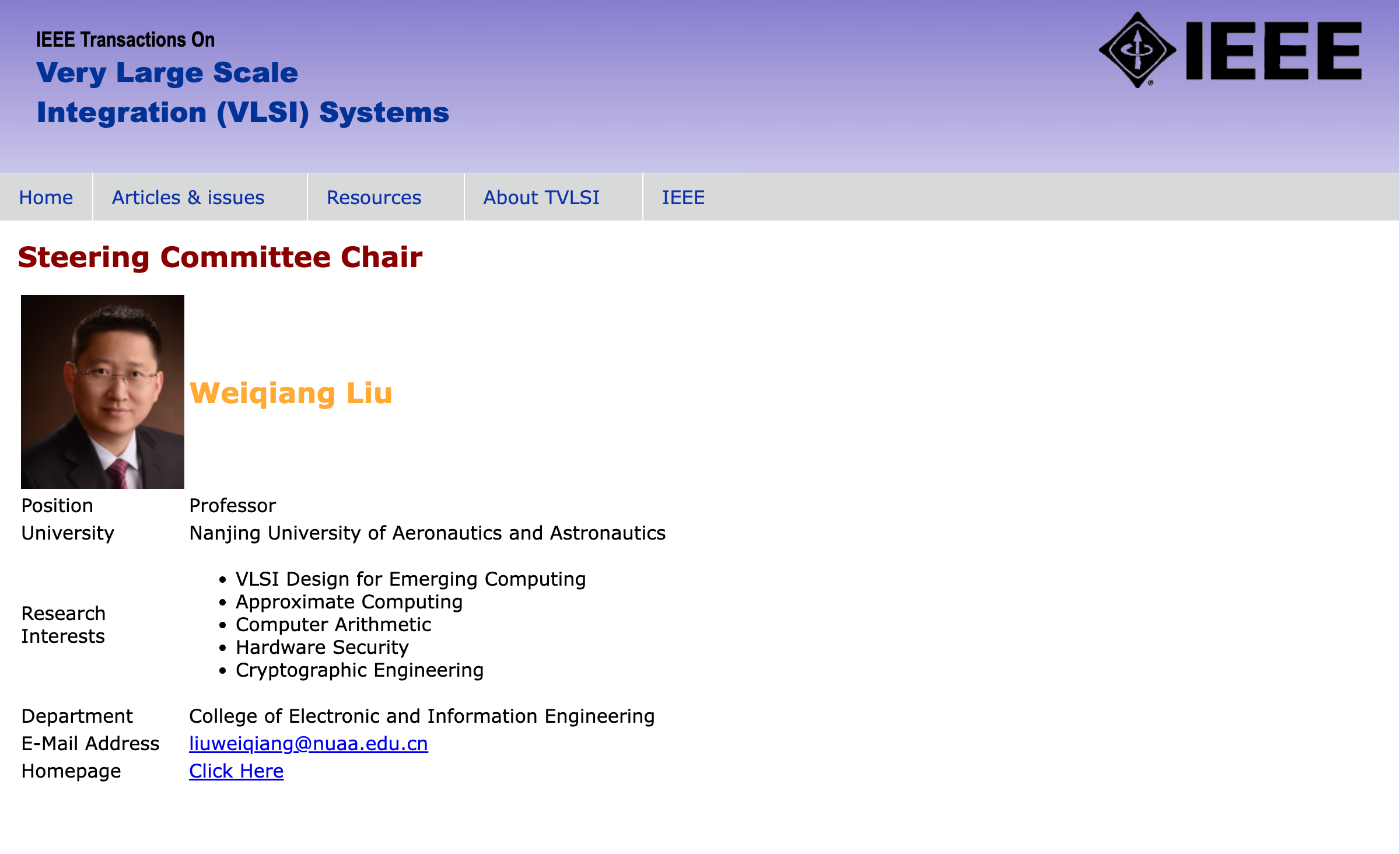 近日,IEEE Computer Society任命刘伟强教授为最新一届IEEE Transactions on Very Large Scale Integration System (TVLSI)期刊指导委员会主席(Steering Committee Chair),首期任期为2023.1-2024.12。本届指导委员会共有五名委员,其他四位委员包括:美国斯蒂文斯理工学院的Bryan Ackland教授(IEEE Fellow、ISSCC执行委员会委员、DAC 2002主席)、法国里昂中央理工学院Alberto Bosio教授(欧洲测试技术委员会ETTTC主席)、意大利卡拉布里亚大学Pasquale Corsonello教授(TVLSI前副主编AEiC)、埃及开罗美国大学Yehea Ismai教授(IEEE Fellow、TVLSI前主编)。TVLSI指导委员会负责遴选期刊主编、监督财务及运行情况等重要事项。指导委员会主席负责TVLSI期刊指导委员会的运行和总体协调等。