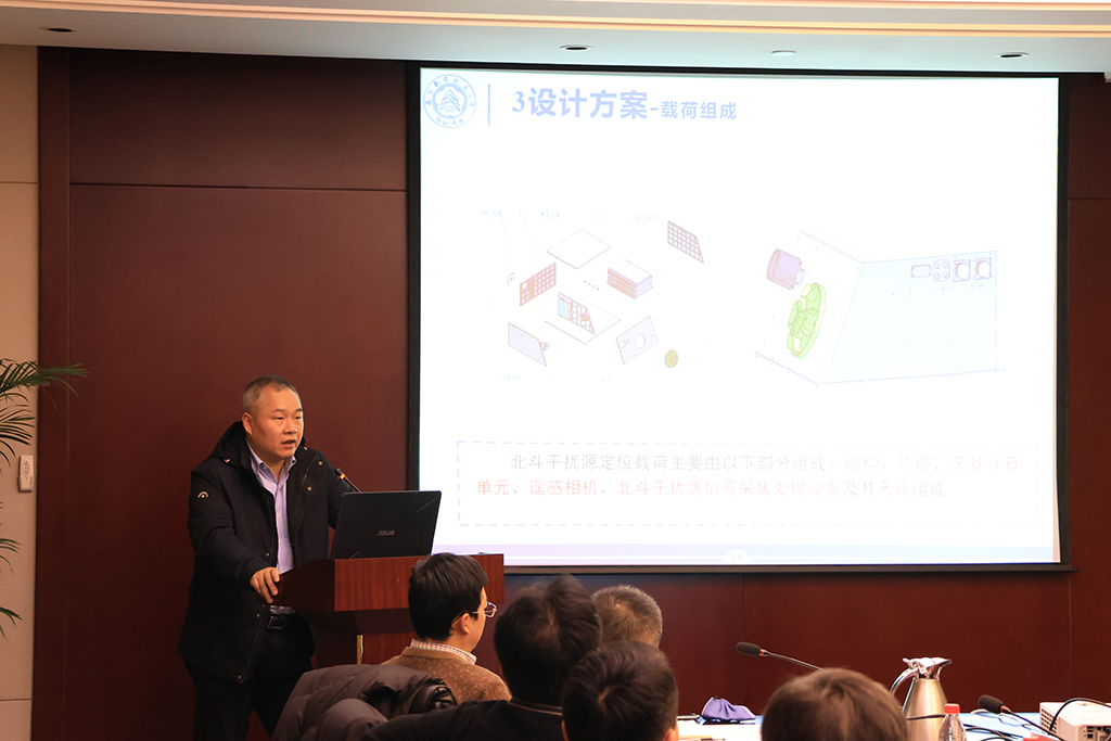 教授李广侠主持,学校副校长吴启晖、载人航天工程软件和数字化中心主任程胜、龙芯中科技术公司董事长胡伟武分别致辞。程剑教授作为项目总师作“基于天基计算的北斗干扰源在轨定位试验项目”、王鹏副教授作“星载对地遥感图像小目标配准定位算法”的报告,其他单位的专家还分别作“高动态北斗定位及地面辐射源采样技术”、“多普勒定位原理及实现”、“龙芯天基云系统及实现“的报告。会议讨论轻松热烈,专家建议中肯高效,会议最后由国家无线电监测中心总工程师黄标作了总结讲话,充分肯定该项目对我国无线电监测和北斗安全应用的重要意义,并预祝项目取得圆满成功。