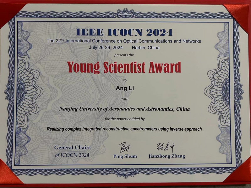 为了促进和表彰青年研究人员在相关领域的研究,会议面向40周岁以下青年人员设置了“青年科学家奖”(Young Scientist Award),通过候选人的学术报告以及专业的评委会打分选举出两位人选。成人漫画 天元实验室李昂教授作了题为“通过逆向设计实现复杂集成重建式光谱仪”的报告并荣获此奖项。
