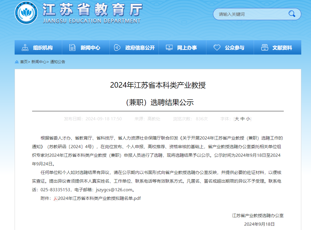 江苏省本科产业教授选聘工作由江苏省人才工作领导小组办公室、江苏省教育厅、江苏省科学技术厅、江苏省人力资源和社会保障厅联合组织实施,今年是第三次开展本科类产业教授选聘,目前学院共有江苏省产业教授6名。。