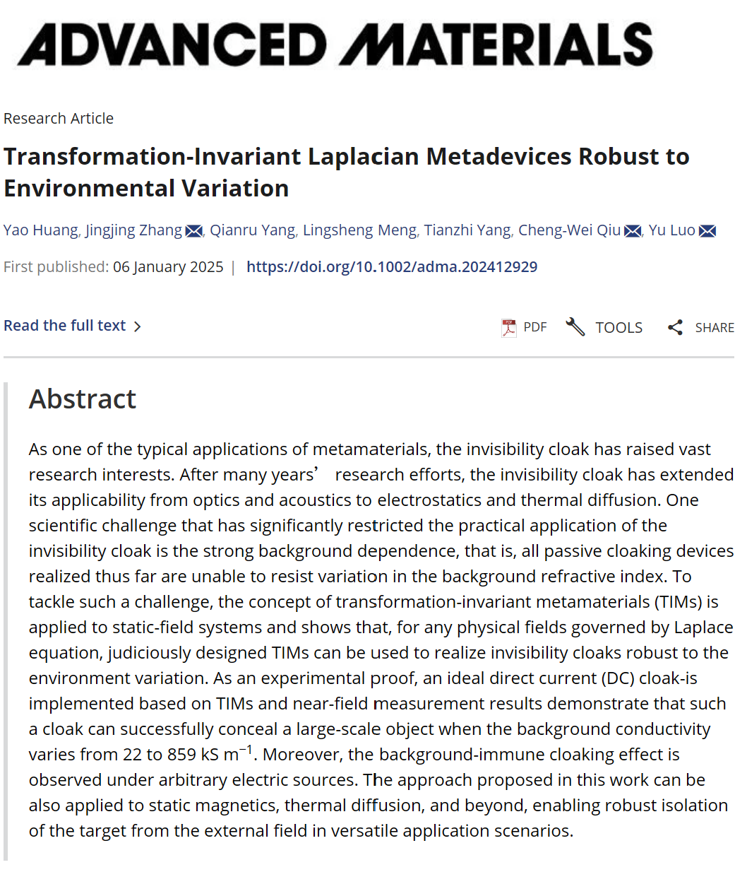 近日,我校成人漫画 (天元实验室)罗宇教授团队联合新加坡国立大学仇成伟教授,以及东南大学张婧婧教授课题组,在《Advanced Materials》上发表题为“Transformation-Invariant Laplacian Metadevices Robust to Environmental Variation”的学术论文。该研究提出并实验实现了一种基于强各向异性超材料(TIM)的隐形技术,成功克服了传统隐身技术在复杂环境中面临的关键挑战,为隐身斗篷技术的实际应用提供了全新的思路。实验室罗宇教授为第一通讯作者,成人漫画 为第一通讯单位。
