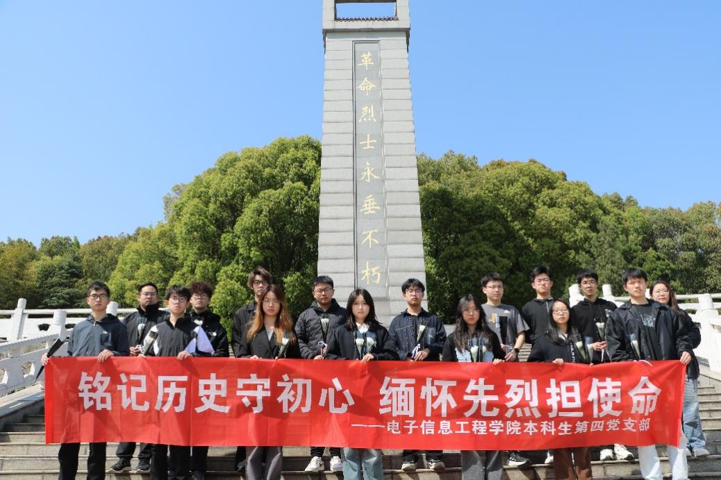 在庄严肃穆的革命烈士纪念碑前,党员同志们缓步上前,将寄托哀思的菊花摆放在碑座周围。支部党员集体瞻仰烈士墓区,驻足阅读镌刻着烈士生平事迹的碑文。当看到多位烈士牺牲时年仅二十余岁,与在场学生年龄相仿时,预备党员张成昊感慨道:“正是这些年轻的生命以他们的热血,铸就了我们民族的脊梁,作为同龄人,我们更应传承这份精神火炬,在科技报国的赛道上跑出当代青年的最好成绩。”