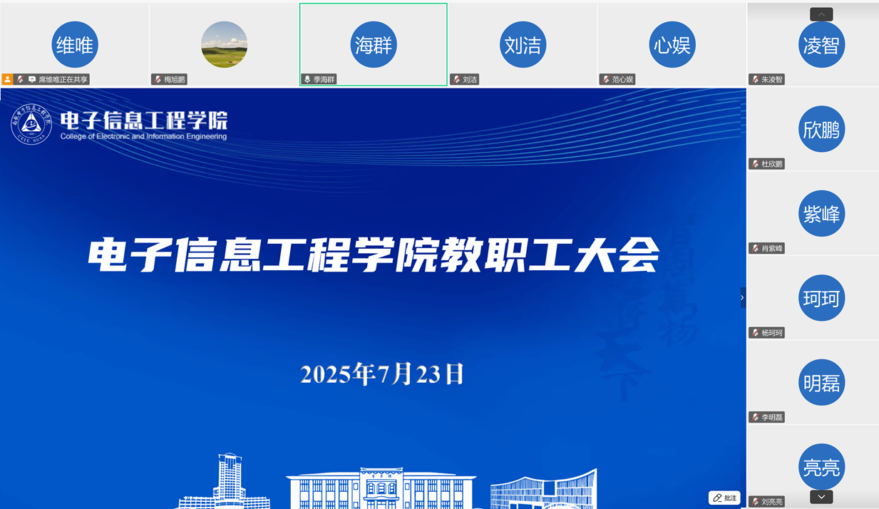 季海群重点介绍了学院人才队伍建设新举措。学院持续完善“校外领军人才任院长+执行院长主持工作”的运行模式,充分发挥领军人才在学术前沿的引领作用和国家重大工程管理方面的丰富经验,为学院发展战略提供宏观指导,加快推进具有空天特色的世界一流电子信息学院建设。最后,他还传达了学校警示教育大会精神。他强调,要进一步提高政治站位,强化纪律意识,以优良作风保障学院事业发展。