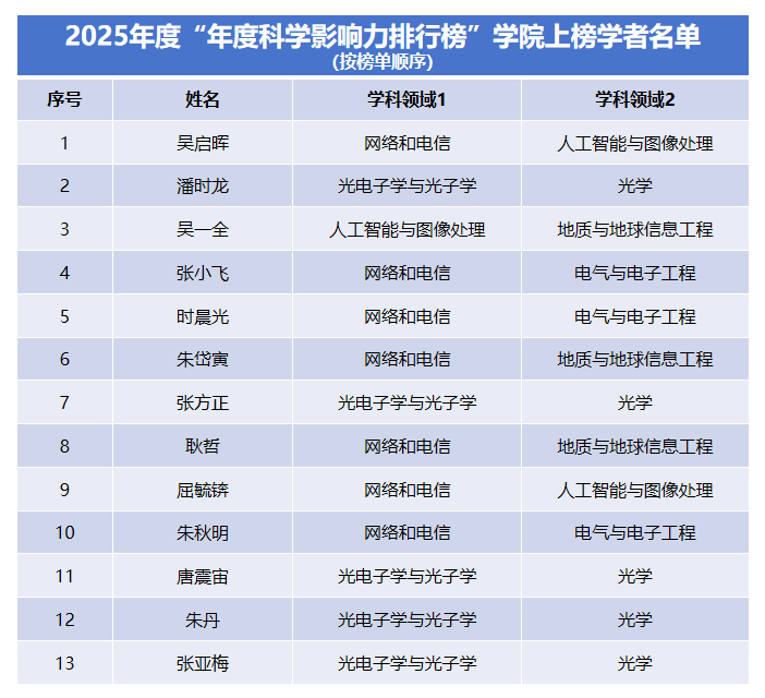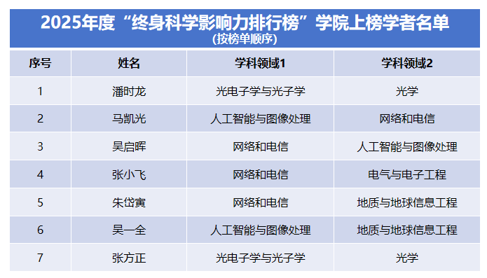 在该榜单的“终身科学影响力排行榜”中,成人漫画 共有7位教师荣登榜单;在“2025年度科学影响力排行榜”中,学院亦有13位教师入选。本次入选,标志着学院在网络和电信、光电子学与光子学、人工智能与图像处理、电气与电子工程等交叉学科方向上的科研实力与学术影响力持续增强,也反映了学院在高水平人才队伍建设方面取得的显著成效。